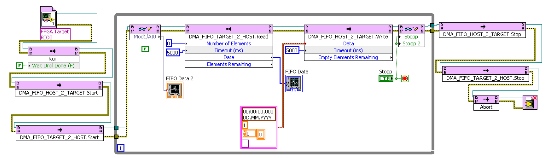 Mein Host-VI habe ich vorerst wie folgt aufgebaut (das Durchführen der FFT ist erstmal entfernt, da ich erstmal schauen wollte, ob überhaupt was aus dem FIFO raus kommt):