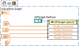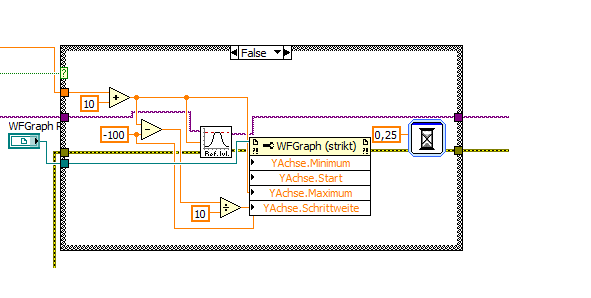 Innerhalb meines Projektes möchte ich die Achse eines waveform graph skalieren. Die X-Achsenskalierung funktioniert bei mir einwandfrei (abhängig von den Eingangswerten wird die Schrittweite berechnet und von Start nach Stop die Achse aufgeteilt, so das ich 10 Skalenteile bekomme).