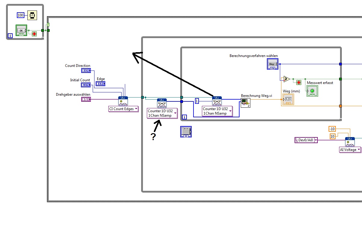 da mir die ganzen Geräte-SubVIs fehlen, nur ein rudimentäres VI im Anhang. Den eigentlichen Aufruf des CTR-Lesens habe ich durch einen Sequenzrahmen dargestellt. Siehe auch die passend geänderte Berechnungsfunktion...