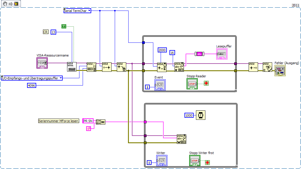 Ja, das ist meine "geniale" Idee. Mein haupt VI arbeiten nach dem Erzeuger-Verbraucher-Pattern. Ich möchte mein VI nicht blockieren, indem ich erst ein Kommando an das serielle Gerät sende, und das braucht dann eine halbe sekunde zum Antworten. Daher sende ich einfach ins blaue das Kommando, und das geht schnell, und mein haupt-VI arbeitet weiter. Im Event-Zweig sammele ich die Antworten ein, ordne diese dann nach Funktionalität und stelle diese dann in die queue, welche normal im Verbraucherzweig alle Befehle abarbeitet. Ja, du hast recht, das könnte gleichzeitig in einem lesen und schreiben enden, aber RS422 wie RS232 ist ja VOLL-DUPLEX, nicht wie dein halbduplex RS485. Daher sollte das gehen. Wie gesagt mein alter (auch schlechter) RS422-auf-USB-Umsetzer lief mit dem identischen VI perfekt und schnell.