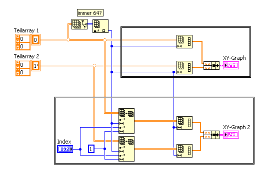 Die zugehörigen Messvorgänge (Widerstand auslesen, Spannungswerte auslesen) funktionieren soweit. Einbinden der Geräte (über IEC-Bus; Programmierung mit GPIB-USB-A Adapter) war auch kein Problem und die Werte werden auch in das erstellte Array geschrieben. Jedoch macht uns die Verarbeitung mit dem XY-Graph aktuell Probleme.