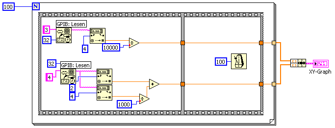 Das Wait wäre meines Erachtens in der Zählschleife besser aufgehoben. Schließlich muss man ja über eine ganze Periode des Funktionsgenerators messen, sprich 10 Sekunden (100 E-3 Hz). Für 100 Messwerte wäre ein Wait von 100 ms abzüglich der Dauer des Auslesen der Spannungsmesser angebracht. Noch besser ist natürlich eine Timed loop (zeitgesteuerte Schleife), da ich die Rampe aquidistant abtasten würde. In der Timed loop kann (muss) das Wait entfallen.