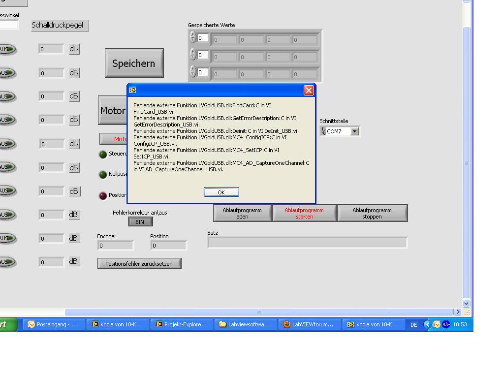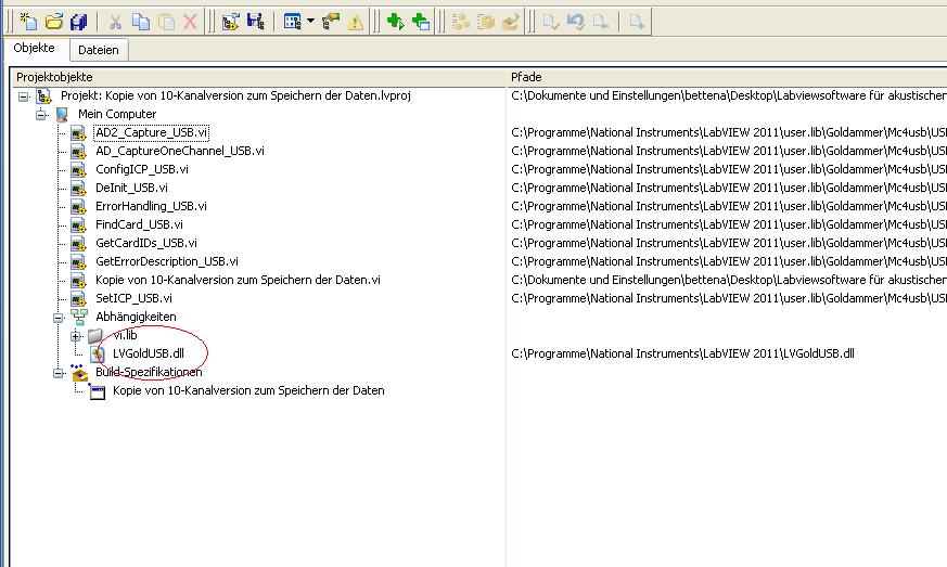 hi, danke für die schnelle antwort. ja ,die dll ist vorhanden. ich habe in den subvis versuchsweise den pfad gelöscht und nur den namen lvgoldusb.dll stehen lassen, dann werde ich beim starten der applikation nach dem pfad für die dll gefragt. den gebe ich an, bekomme aber trotzdem die gleiche fehlermeldung.