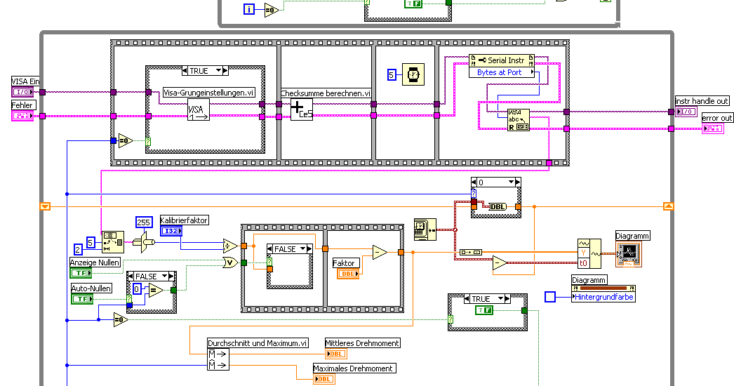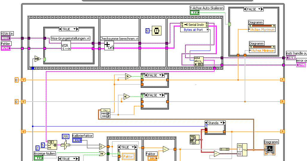 Ich würde ja gerne mal mein komplettes VI Hochladen, jedoch fehlen euch da die Hardwarekomponenten dazu. Deswegen habe ich am Anfang dieser Diskussion ein VI hochgeladen, welches nur schematisch den Ablauf in meinem VI wiedergibt. Deswegen benutze ich auch das Express-VI. Klar kann man sich so etwas ähnliches selber "basteln", aber mir erschien es hier einfacher dieses zu nehmen, da die Messzeit ein wichtiges Kriterium für die spätere Ausführung ist. Autoskaling ist deswegen wichtig, weil sich die Messzeit von Messung zu Messung ändern kann. Aber über den Eigenschaftsknoten "XAchseMaximum" kann man ja eine kleine Routine (wenn man das so nennen kann???) vorschieben, die je nach gewählter Messzeit die X-Achse skaliert.