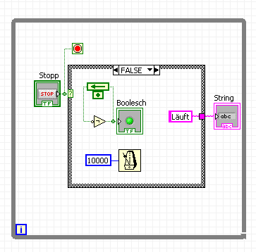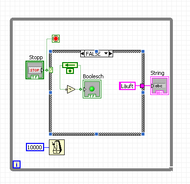 In jedem Schleifendurchlauf werden alle Funktionen innerhalb der Schleife in beliebiger Reihenfolge abgearbeitet. Es sei denn, sie sind durch den Datenfluss sequenziert. Eine Aufgabe die innerhalb der Schleife erledigt werden muss, ist zum Beispiel den aktuellen Wert des Stopp-Buttons an deine ODER-Verknüpfung zu übergeben. Wenn du erst danach den Stoppbutton drückst, hat das auf den aktuellen Schleifendurchlauf ekine Auswirkungen. LabVIEW arbeitet also zunächst den aktuellen Schleifendurchlauf ab und beginnt dann den nächsten. Diesesmal ist der Button gedrückt worden, trotzdem muss der Schleifendurchlauf vollständig abgearbeitet werden. Dadurch können fast zwei vollständige Durchläufe nach dem Drücken von Stopp entstehen.
