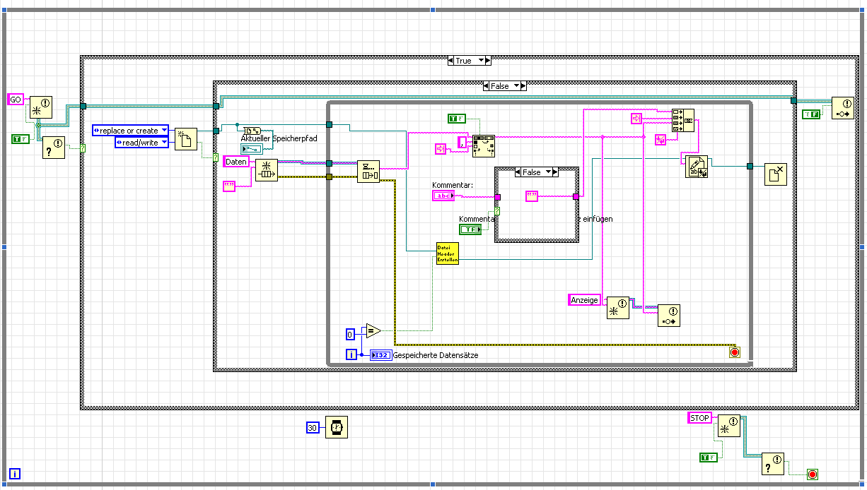 Ich dachte Pufferung bei Datei schreiben heißt, dass zuerst in einen Puffer geschrieben wird, und wenn der voll ist in die Datei. Nachdem ich aber wirklich immer sofort schreiben wollte (falls der PC mal abstürzen sollte..Tongue), habe ich diesen Puffer mal bei dem VI deaktiviert. Die Konsequenz war blöderweise, dass die Datei komplett leer geblieben ist. Bei jedem "in Datei schreiben" schreiben werden ungefähr 80 Zeichen geschrieben.