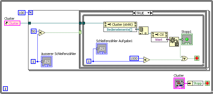 in meiner "hauptloop" meines main.vis wird subvi1 gestartet. darin befindet sich eine for-loop (sie war eine der änderungen seit der alten version, ind er es noch funktionierte). in dieser for loop werden nacheinander subvi2 und subvi3 aufgerufen. diese enthalten jeweils eine while loop, die schon früher terminieren sollte falls button gedrückt (antwort des buttons ist aber immer false, da ich ihn ja nciht drücken kann während die loops laufen).