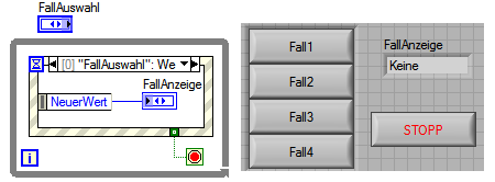 Ich habe 4 Knöpfe angelegt. Ich möchte, dass beim Druck auf Knopf 1 der Fall 1 abgehandelt wird, bei Knopf 2 Fall 2 usw. eigentlich wäre da ja die Case-Struktur geeignet, aber ich bekomme es einfach nicht hin, da die Knöpfe zunächst nur Binäre Signale liefern, also True oder False. Kann ich da nicht einfach eine Identifikation "anhängen" ? Und wie bekomme ich das in die Case-Sequenz? Ist Case überhaupt dafür geeignet, oder geht es einfacher?
