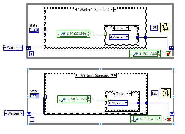 Mit den anderen Funktionen funktioniert das ganz gut da schalte ich einfach eine Case Struktur an und aus aber das Problem bei dem SubVI Datenexport.vi ist, dass es nicht in einer weiteren Schleife sein darf, da sonst jedes mal die Datei neu angelegt wird. Wenn es aber in keiner extra Schleife ist, wird nur einmal diese Case Struktur angeschaut und wenn dann der Schalter "Messung aktiv" nicht aktiviert ist, wird einfach nie wieder aufgezeichnet.