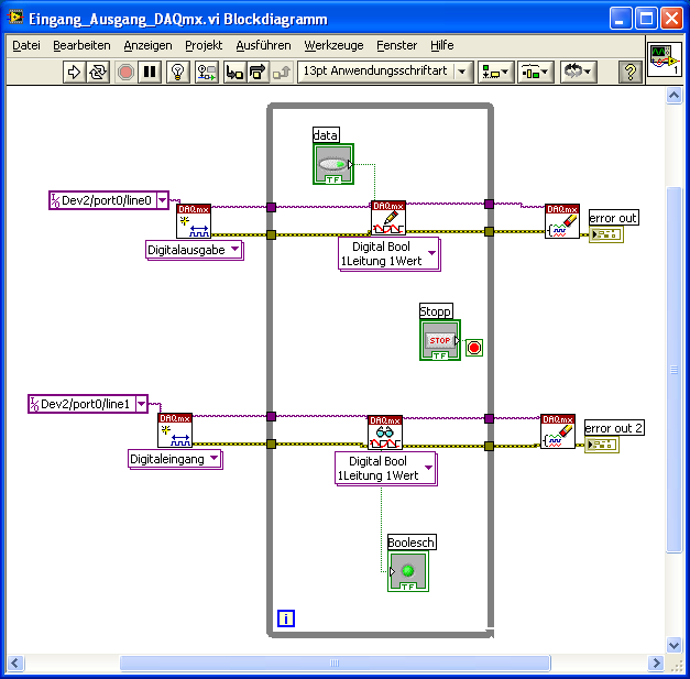 ich verwende als Interface das NI 6008. Bei der Programmierung in LabVIEW nehme ich die Konfiguration über den DAQ-Assistenten vor. Z.B. konfiguriere ich einen digitalen Leitungsausgang port0ne0. Den möchte ich über einen Schalter (boolesch) schalten. Wie mache ich das fachlich richtig? Es scheint so zu sein, dass immer der komplette Port betrachtet werden muss, obwohl ich nur eine Leitung konfiguriert habe. Eine Lösung habe ich gefunden, weiß aber nicht, ob das eine saubere Lösung ist. Ich habe einen Screenshot (LabVIEW 8.2) beigefügt.