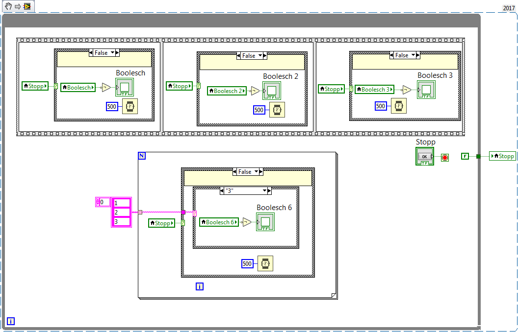 Ich habe vor ca. 100 Jahren hier mal das Beispiel "Ampel" gepostet. Es ist ein Prüfungsbeispiel von NI, und NI will, dass das Programm gegebenenfalls sofort beendet wird, und nicht erst nach Beenden eines vollständigen Ampelzyklus. Vielleicht ist das noch aufzufinden.