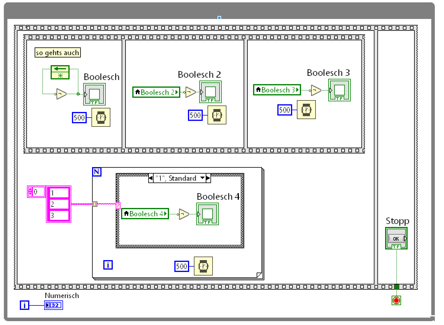 Ich habe vor ca. 100 Jahren hier mal das Beispiel "Ampel" gepostet. Es ist ein Prüfungsbeispiel von NI, und NI will, dass das Programm gegebenenfalls sofort beendet wird, und nicht erst nach Beenden eines vollständigen Ampelzyklus. Vielleicht ist das noch aufzufinden.