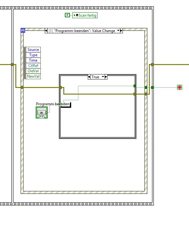 Ich habe ein Programm mit mehreren vers. Schleifen. Um das Programm nicht immer wieder nach einem Durchlauf neu starten zu müssen, habe ich eine While-Loop um das Ganze gezogen. Somit läuft das Programm beliebig oft durch - wie erwünscht. Jetzt zu meiner Frage: wenn ich jetzt auf den Stopp-schalter der äußeren While-Loop klicke, läuft das Programm noch einmal durch und stoppt erst dann. Ich möchte aber, dass das Programm sofort, ohne weiteren Durchlauf stoppt. Was muss ich einfügen damit die While-loop sofort stoppt?