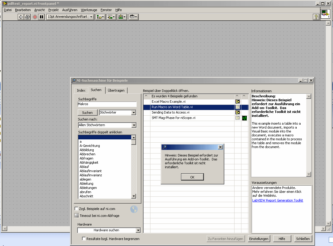 ' schrieb:Vielleicht kannst du das Makro in Word selbst aufnehmen, als *.bas abspeichern und über LabVIEW ausführen lassen. Es gibt auch die Möglichkeit, den VisualBasic-Code für das Makro direkt in LabVIEW zu hinterlegen.