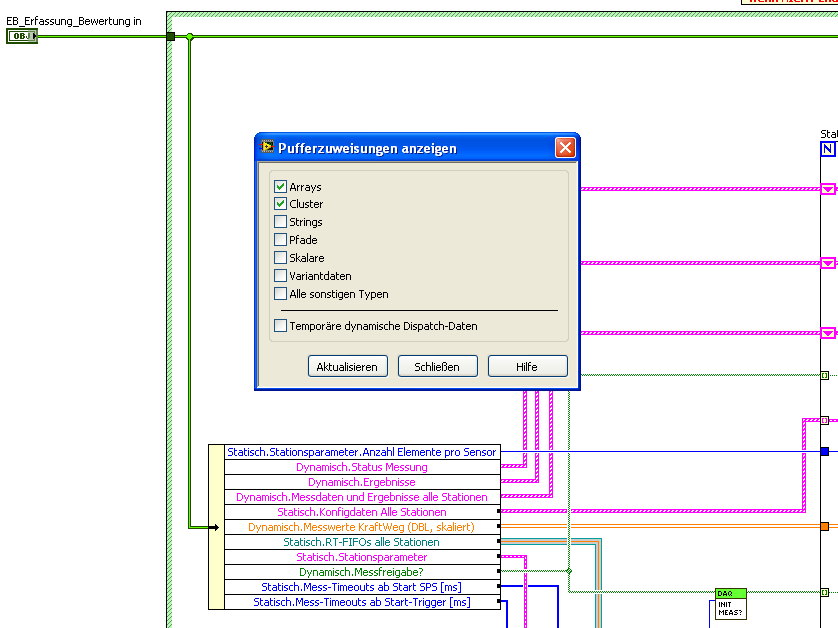 Mein Speicher läuft z.T. voll bei vielen Messwerten, da ich in verschiedenen SubVIs "Unbundle By Name" nutze. Über das Pufferzuweisungs-Tool sieht man, dass Speicher zugewiesen wird.