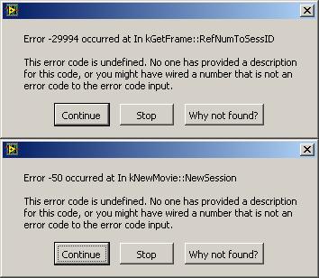 Läuft mein Programm jetzt durch und ich mache mehrere Auswertungen, bekomme ich - unterschiedlich - nach 15 bis 25 durchlaufenen Videos eine Meldung, dass ein bislang unbekannter Fehler produziert wurde im Modul "In kNewMovie" bei der Aktion NewSession.
