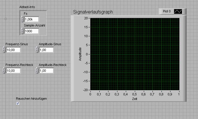 Es soll so funktionieren ,dass man über eine strikt typdefinierte Enimeration die Signalverknüpfung auswählen kann und das Programm dann auf Sub-Vis zurückgreift. Das ganze soll in einer While-Schleife sein. Zusätzlich kann man dann noch auswählen, ob eine Glättung bzw. ein Rauschen eingefügt werden soll.