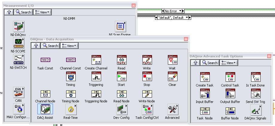 Unter Measurement I/O (Palette ganz links im Bild) findest du die Palette für NI-DAQmx. Dies Palette (in der Mitte des Bildes) enthält alles, was man so benötigt um mit dem DAQmx zu arbeiten. Die Funktionen um einen Task zu erstellen finden sich unter "Task Config/Ctrl" (ganz rechts).