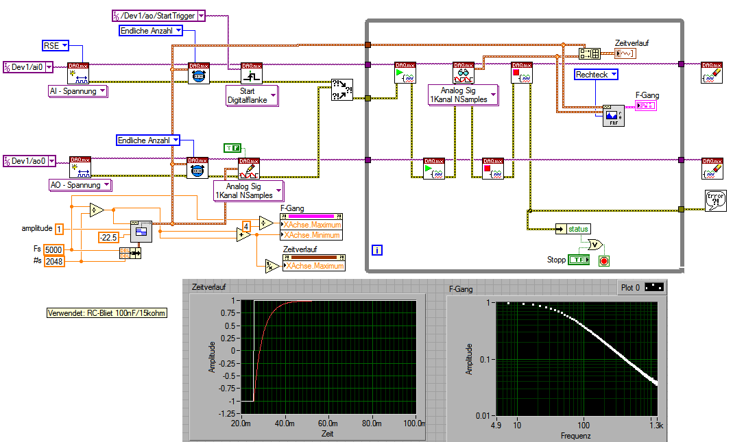 Gebe Dir hier ein funktionierendes Beispiel, habe das möglichst einfach gemacht. Während das VI läuft, läßt sich allerdings allerdings nur am RC-Glied herumspielen - falls das ein Poti hat.