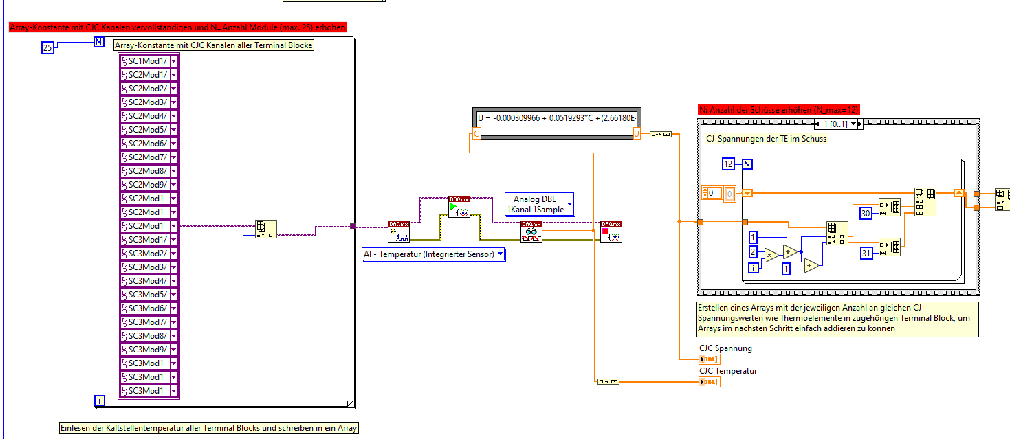 Zu deiner Frage: Es ist so, dass zu jedem Modul eine Kaltstellentemperatur ausgegeben wird. Meiner Meinung nach wird jede Kaltstellenspannung hintereinander in diesen Array geschrieben. Die Kaltstellentemperatur wird anschließend in eine Spannung umgewandelt. Diese Kaltstellenspannung wird danach in 732 Zellen des Arrays geschrieben, um diese Spannung zu den anderen 732 Spannungen zu addieren. Ich habe nämlich 732 Thermoelemente.
