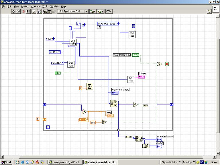 habe noch mal nir den Schleifen gespielt. Wenn ich die Initialisierung auserhalb der Schleife durchführe ändert sich nichts in der Ablaufgeschwindigkeit. Jetzt habe ich noch festgestellt, dass wenn kein Triggersignal kommt läuft die Messung trotzdem weiter. Wenn ich die Messwerte im Vordergrund aufnehme, also mit der AInScFg, bleibt die Messung stehen wenn kein Triggersignal kommt. Daher würde ich eher diese Methode bevorzugen. Aber auch hier läuft die Messung nicht mit 20 Hz. Eher mit 2-3 Hz.