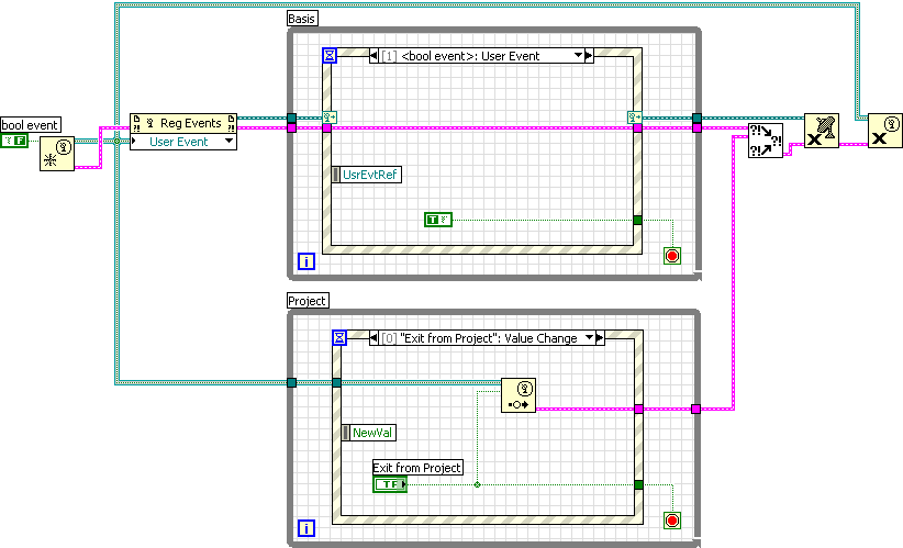 Es sind zwei unterschiedliche Threads. Thread 1 (obere Schleife) ist das Hauptprogramm, von dem Thread 2 (untere Schleife) beendet werden kann. Dann wird über das registrierte Event (Exit from Basis: Value Change) das "Project" (unterer Thread) beendet. Nun soll der andere Weg auch funktionieren, d.h. beide Threads soll durch "Exit from Project" beendet werden. Die Schnittstelle zwischen den beiden Threads ist der Ausgang "Event Registration Refnum" der Funktion "Register for Events", die in "Basis" ausgerufen wird.