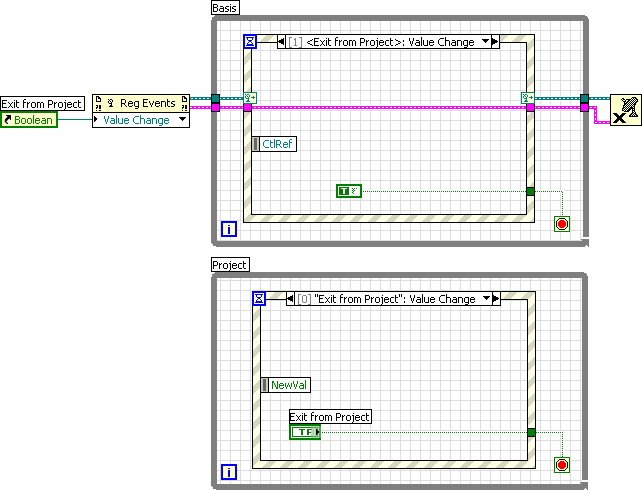 Die Schleife "Basis" soll aus der Schleife "Projekt" mit "Reg Events, Value Change" beendet werden.