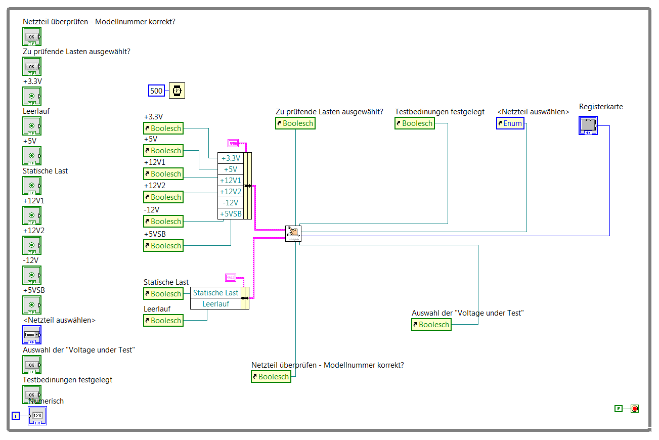Mein Problem: Für eine Case Struktur, welche ich mit einem boolschen Schalter (nächster Prüfpunkt) weiterschalten möchte, benötigte ich einen Impuls. Damit nur ein Register weitergeschaltet wird und nicht mehrere. Aber die Latch Schaltfunktion funktioniert leider nicht (akzeptiert das Programm ja nicht). Ich habe nun eine Wartezeit eingefügt. Wenn ich den Button für 500ms drücke schaltet es auf das nächste Register. Wenn ich aber länger Drücke läuft das Programm einfach durch.