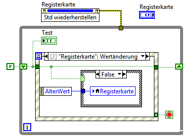Das Beispiel Register.vi zeigt zwei Registerkarten. Man soll erst auf Registerkarte 2 (mit dem Stopp-Schalter) wechseln dürfen, wenn man mindestens einmal den Hello-World-Schalter betätigt hat. Das ist natürlich eine grobe Vereinfachung des Problems. D.h. es hilft mir nicht, nur den Stopp-Schalter zu deaktivieren.
