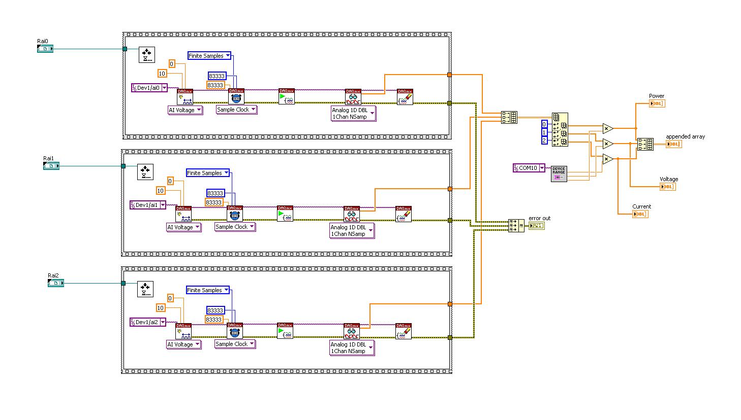 Allerdings weiß ich nicht wie ich mehrere Analogeingänge (ai x) ein Kanal einlesen kann. Manche Geräte können das ja, doch hier kann man es zumindest nicht direkt über den I/O. Einen Task mit allen drei erstellen hat auch nicht funktioniert, danach wurde mir gar nichts mehr im Ausgabe-Graph angezeigt. Wisst Ihr eine Lösung?
