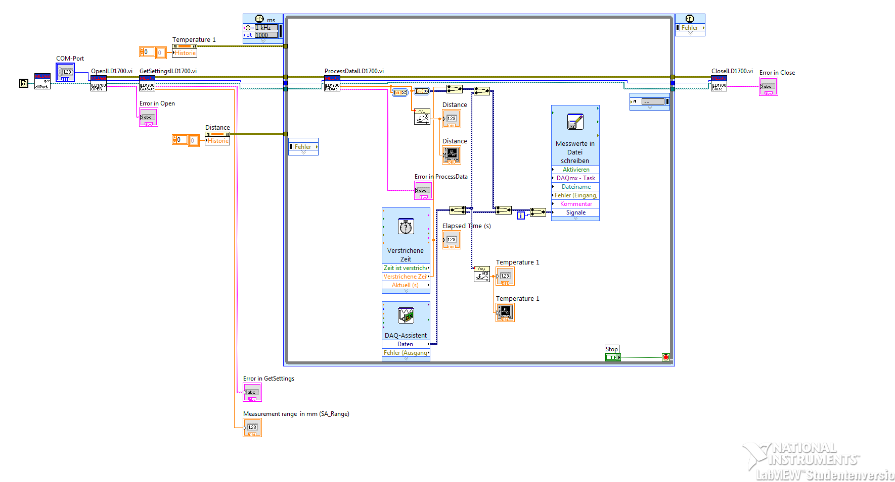 Ich möchte mittels eines Laser-Sensors der Firma Micro-Epsilon, Typ optoNCDT 1402 die Veränderung eines Abstandes messen. Der Laser-Sensor ist über einen USB to RS-422 CONVERTER mit dem PC verbunden. Die Implementierung des Sensors in Labview erfolgt mittels eines von Micro-Epsilon zur Verfügung gestellten VI's.