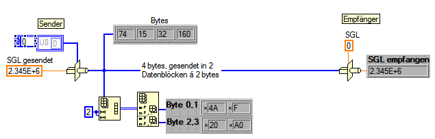 So würde jetzt die 4-byte Übertragung eines Single-Values mit Vor- und Rück-Konversion aussehen. Es gibt dabei keinerlei Einschränkungen im Zahlenbereich des Singles: