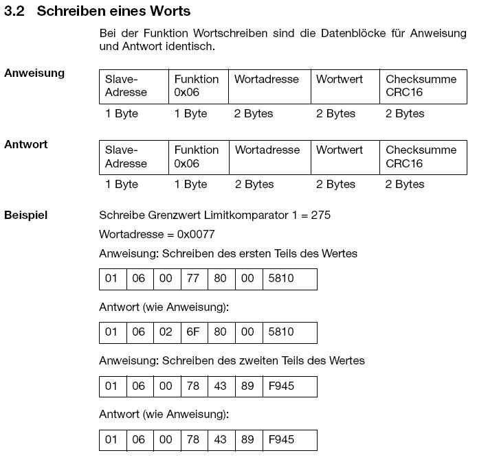 Also es wird hier (in dieser Doc) in der Terminologie unterschieden zwischen "Wordadresse" und "Word". Wenn hier nur von "Word" gesprochen wird, dann ist ein "Datenwort" gemeint. Ein Datenwort ist einfach ein U16-Wert, verteilt auf zwei Bytes (U8). Die Bezeichnung "Datenwort" statt Zahl wird hier deshalb verwendet, weil es keine reinen Zahlenwerte sind. Es handelt sich z.B um Gleitkomma-Single-Zahlen, die in zwei Datenworten (4bytes) übertragen werden, und die, gewissermaßen verschlüsselt, den Zahlenwert der Single Zahl zwar enthalten, aber selbst nicht diese Zahlenwerte sind. Deshalb die Bezeichnung Wort (Bytes) statt Wert oder Zahl.