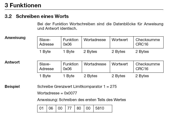 Und wozu ich das ganze brauche ist unten im Anhang. Das ist ein Ausschnitt aus meiner Anleitung der Schnittstellenbeschreibung. Ich gebe den Befehl in Form eines Wortes vor und später den zugehörigen Wortwert.