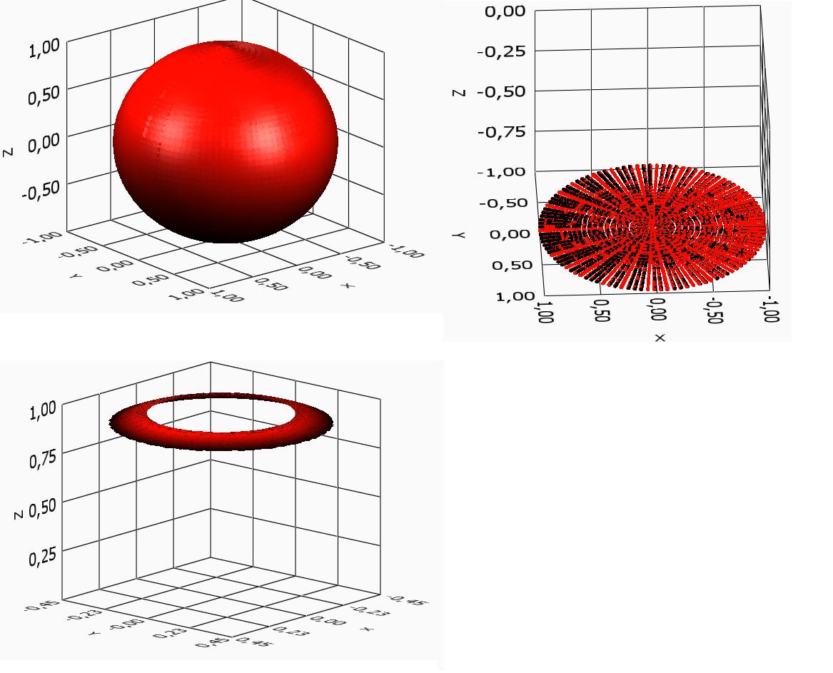 Ich habe auch ein Exempel gefunden, wie man eine Kugel im 3D Graph erzeugen kann, aber als ein ganzer Körper mit konstanter Intensität. Ich finde es klasse, dass man den Graph beim Betrachten verdrehen kann. Es wäre genau das richtige für mich. ABER es fehlen noch 2 Dinge.