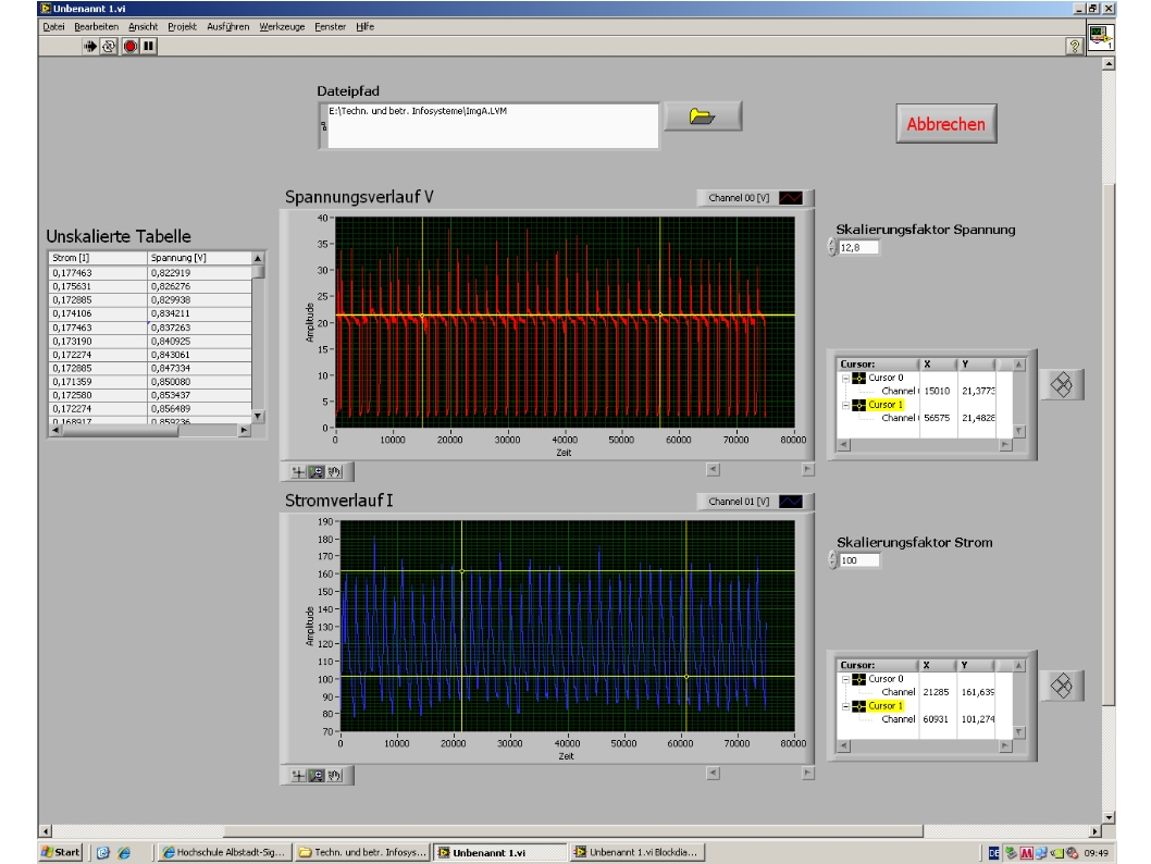 Es soll eine lvm Datei die Spannungs und Stromdaten beinhaltet geöffnet und angezeigt werden. Danach soll mit zwei Cursorn einen Bereich ausgewählt werden. Dieser Bereich soll nun in eine neue Datei geschrieben werden und in einer Endlosschleife ausgegeben werden(Über while Schleife).