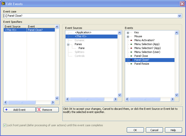 Du kannst diese Ereignis (<Application -> Application Instance Close? oder <This Vi> -> Panel Close?) in der Event-Strukur abfragen und dann ensprechend reagieren.