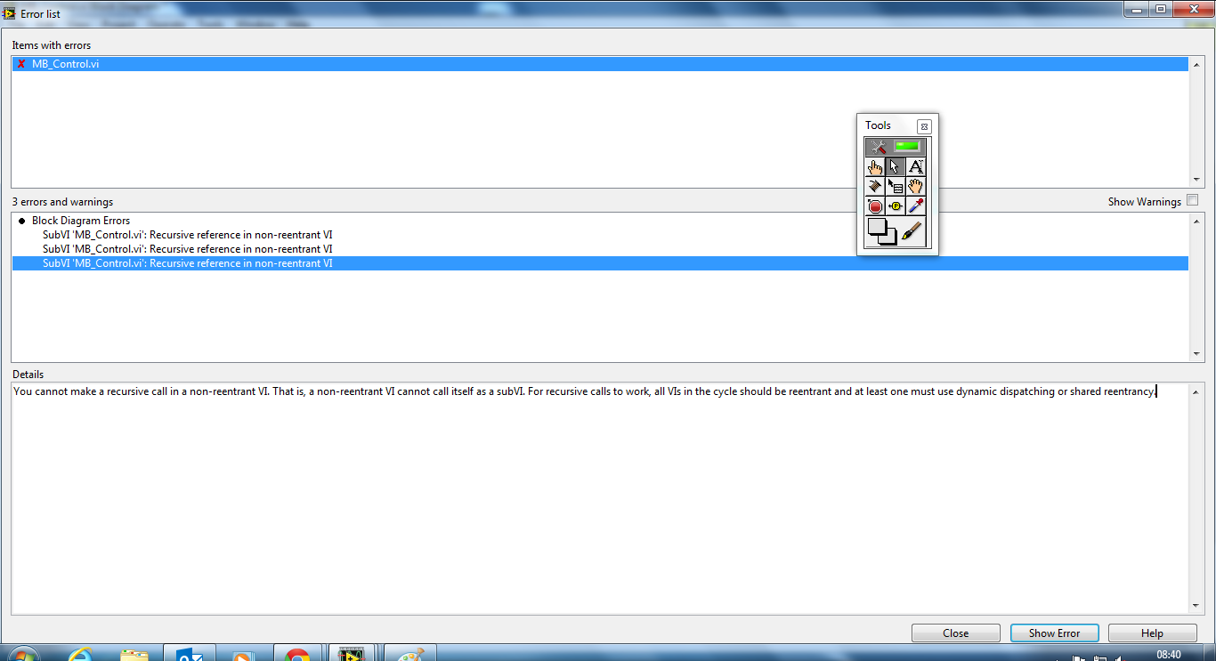 weiter hab ich neu VI erstellt wie am Bild und dann erscheint folgendes Fehler