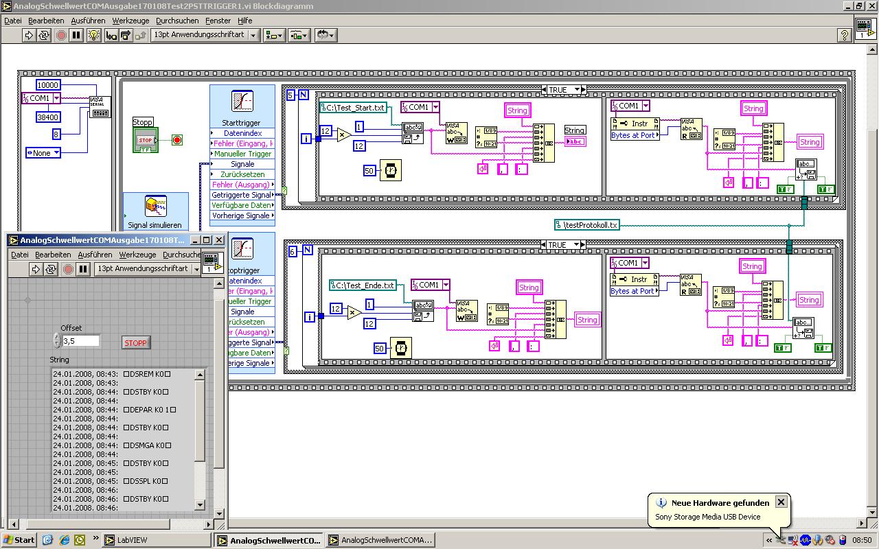 Ich habe das signalisierte Signal, welches jetzt reell vorliegt, mit dem Express-VI DAQ-Assistent ersetzt. Ausserdem habe noch eine Datenerfassung eingebaut. Soweit funktioniert auch alles. Es lief Stundenlang, über Tag und Nacht. Dabei traten keinerle Probleme auf, bis ich eben den DAQ-Assistenten eingebaut habe. Ich bekomme regelmäßig Fehlermeldungen über Pufferfehler. ...wurde überschrieben..bevor gelesen....so in der Art. Das Ganze passiert aber nur wenn es wirklich wichtig ist. Als ich die Spannung über ein Labornetzteil angelegt habe, lief es auch Stundenlang...
