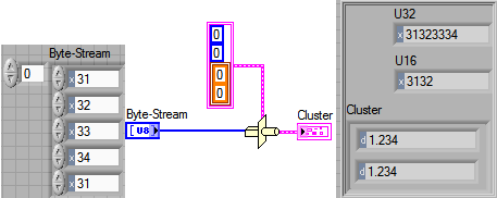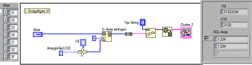 Ich habe einen großen Cluster im Frontpanel und Knöpfe mit "Senden" und "Empfangen". Ich erhalte von diesem Teil Daten im Datentyp 1D-U8-Array (Bytestream) mit bestimmter Länge.