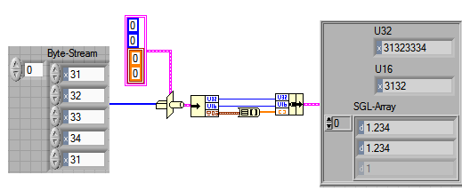 Anmerkung: Da die Arraylänge mit 2 Elementen immer konstant ist, wäre es sinnvoller, wenn man statt des SGL-Arrays ein Cluster hätte. Damit entfällt die Arraygrößenangabe im Bytestrom. d.h man könnte direkt den Originalstream zur Konvertierung benutzen und alles würde viel einfacher. Und das ist sogar untertrieben: Das ganze Problem schrumpft dann zu enem Nichts zusammen.