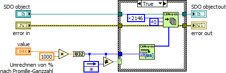 Danke für den Hinweis. Wir arbeiten mit dem standart CANopentool von Labview und erkennen daher nicht, was in der Case Strukture oben rechts für ein VI eingebaut ist. Ist das ein SDO Write? Und wie hast du ein SDO Object in bzw out erzeugt ohne vorheriges VI. Wenn es ein SDO write ist, verlangt dieses bei uns ein Array als Eingang jedoch ist der Verglewich ja ein reines U32 Element.