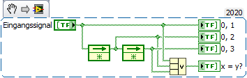 Und zuletzt entfernt man noch die While-Loop, ersetzt das Schieberegister durch FeedbackNodes und löscht die Wartezeit: