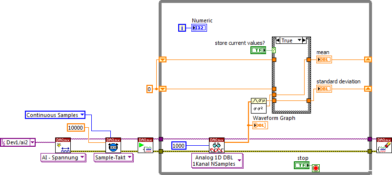Also noch mal Basislinie ist für mich einfach das Signal aus meinem USB-6008 Board ohne dass man an das Board irgendwelche Signalquellen dranmacht. Was meinst du als definition von Basislinie? Jetzt muss ich nur noch irgendwie di aktuelle Spannungswerte mit Mittelwert und standardabw. von Basislinie vergleichen und mit Hilfe einem CASE-Structure ein "peep" geen lassen oder? Aber Wo soll das Case-Structure genau sein?