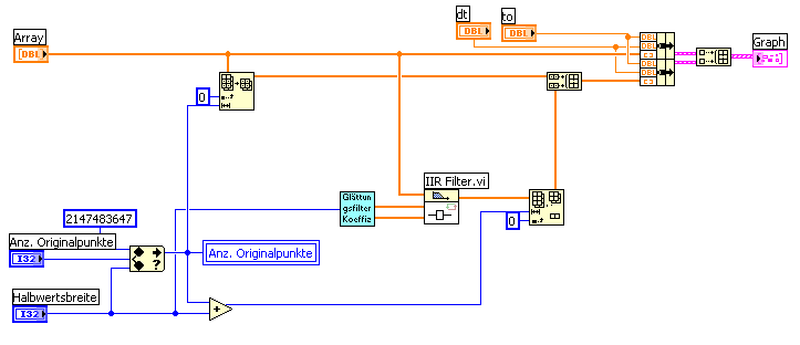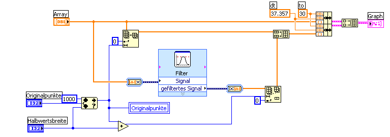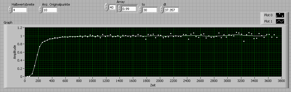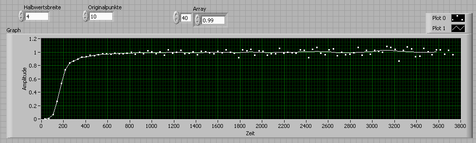 Ich verwende hier ein Express.vi (Filter) für die Glättung der Kurve. Der Nachteil ist jetzt - aber ich habe keine Lust das zu ändern - daß, wenn ich die Halbwertsbreite der Mittelwertbildung ändere, das sowohl im Programm als auch im Express-vi gestan werden muß. An die Halbwertsbreite im Express-Vi komme ich aber nicht per Anschlußdraht, sondern nur über rechte Maustaste/Eigenschaften heran, man muß also immer beides synchron ändern.