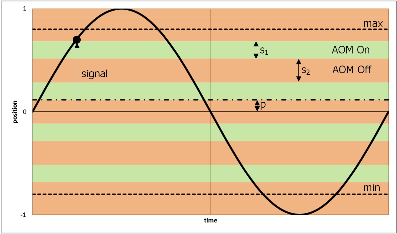 Ich verwende auch eine Galvanometer mit angeflanschtem Spiegel zum scannen. Da man einen Laser auch nicht einfach so schnell aus und an schalten kann wird statdessen die Amplitude mithilfe eines Akustooptischen Modulators (AOM) moduliert. Ich schalte also mit Labview nicht direkt den Laser An und Aus, sondern den AOM, der dann den Laser fuer mich An und Aus schaltet. Am Ende soll eine gitterfoermige Beleuchtung einer Biologischen Probe mit einer Gitterkonstatnte von ca. 10 µm herauskommen bei dem ich die Phase, die Gitterkonstante und den prozentualen Anteil der Beleuchtung einstellen kann. Das alles soll dazu dienen die Aufloesung eines 3D Lichtschichtmikroskopes zu verbessern.