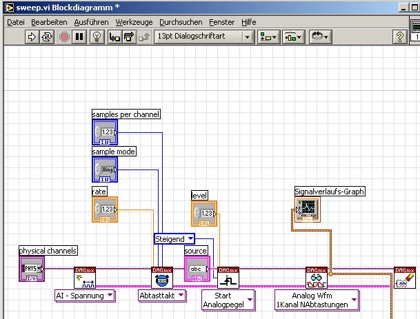 Du kannst auch den DAQ-Assistenten verwenden. Der erzeugt dir ein ein paar einfachen Schritten ein VI zum Messen und Darstellen deines Signals.