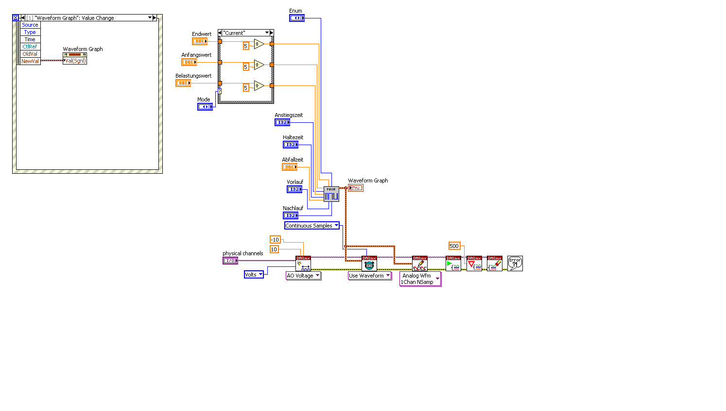 Wenn ein Graph neue Daten anzeigen soll, muss er diese auch bekommen. In deinem Bild oben passiert das doch schon: es wird eine Waveform generiert und diese wird dann im Graph dargestellt und mit DAQmx ausgegeben. Was brauchst du denn noch?