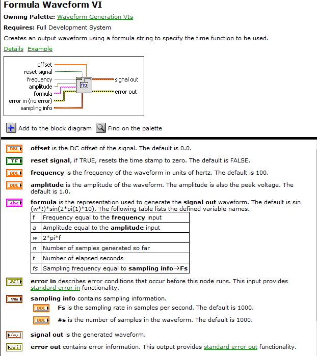 Um daraus ein Signal zu erzeugen (roter Kasten) habe ich das "Formula Waveform VI" benutzt und als Formel einfach den Amplitudenwert "a" eingegeben.