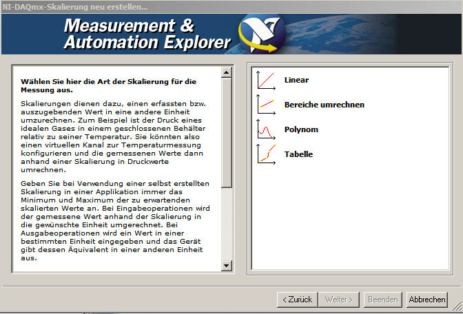1.) Man kann die Skalierung von Signalen auch schon im M&A-Explorer vornehmen. Bei DAQmx Read kommen dann schon statt der Spannungs-Einheiten die fertig skalierten Werte, z.B. in kg, heraus. Ja man kann damit sogar die nichtlineare Sensorkurven anpassen. (Es wurde schon erwähnt, daß man das auch mit DAQmx-Eigenschaftsknoten machen kann)